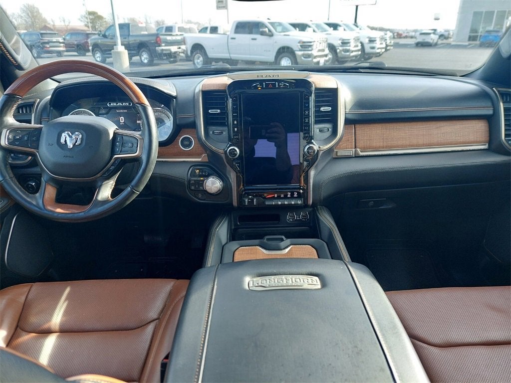 #1 Seat Foam Cushion, 1-Yr SiriusXM Guardian Trial, 10 Speakers, 12 Touchscreen Display, 3 Rear Seat Head Restraints, 4 Way Front Headrests, 4-Wheel Disc Brakes, 48V Belt Starter Generator, 4G LTE Wi-Fi Hot Spot, 5-Year SiriusXM Travel Link Service, ABS brakes, Adaptive Cruise Control w/Stop & Go, Adjustable pedals, Advanced Safety Group, Air Conditioning, Alloy wheels, AM/FM radio: SiriusXM, Anti-Spin Differential Rear Axle, Apple CarPlay, Apple CarPlay/Android Auto, Audio memory, Auto High-beam Headlights, Auto-dimming door mirrors, Auto-dimming Rear-View mirror, Automatic temperature control, Blind Spot & Cross Path Detection, Brake assist, Bucket Seats, Bumpers: chrome, Compass, Delay-off headlights, Disassociated Touchscreen Display, Dome Dual LED Reading Lamp, Driver door bin, Driver Seat Memory, Driver vanity mirror, Dual front impact airbags, Dual front side impact airbags, Dual-Pane Panoramic Sunroof, Electronic Stability Control, Emergency communication system: SiriusXM Guardian, Foam Bottle Insert (Door Trim Panel), For Details, Visit DriveUconnect.com, Front anti-roll bar, Front Bucket Seats, Front Center Armrest w/Storage, Front dual zone A/C, Front fog lights, Front reading lights, Front Seat Back Map Pockets, Front wheel independent suspension, Full Speed Forward Collision Warning Plus, Fully automatic headlights, Garage door transmitter, Genuine wood console insert, Genuine wood dashboard insert, Genuine wood door panel insert, Google Android Auto, GPS Antenna Input, GPS Navigation, harman/kardon 19 Speaker Premium Sound, HD Radio, Heated door mirrors, Heated Front Seats, Heated front seats, Heated rear seats, Heated Second Row Seats, Heated Steering Wheel, Heated steering wheel, Illuminated entry, Integrated Center Stack Radio, Lane Keep Assist, Leather steering wheel, LED Dome/Reading Lamp, Longhorn Level 1 Equipment Group, Low tire pressure warning, Manufacturer's Statement of Origin, Memory seat, Multi-Function Tailgate, Navigation System, No Satellite Coverage w/HI/AK/PR/VI/GU, Occupant sensing airbag, Outside temperature display, Overhead airbag, Overhead console, Panic alarm, Parallel & Perp Park Assist w/Stop, ParkView Rear Back-Up Camera, Passenger door bin, Passenger vanity mirror, Pedal memory, Power 4-Way Driver Lumbar Adjust, Power 4-Way Passenger Lumbar Adjust, Power 8-Way Driver & Passenger Seats, Power Chrome Trailer Tow Mirrors, Power door mirrors, Power driver seat, Power passenger seat, Power Running Boards, Power steering, Power windows, Premium Leather Seats w/Filigree, Protection Group, Quick Order Package 27K Longhorn, Radio data system, Radio: Uconnect 12 w/Navigation, Radio: Uconnect 4C Nav w/8.4 Display, Rain sensing wipers, RamBox Cargo Management System, Rear 60/40 Folding Split Recline Seat, Rear anti-roll bar, Rear seat center armrest, Rear step bumper, Rear window defroster, Remote keyless entry, Security system, SiriusXM Satellite Radio, SiriusXM Traffic Plus, SiriusXM Travel Link, SiriusXM w/360L, Speed control, Split folding rear seat, Steering wheel mounted audio controls, Tachometer, Telescoping steering wheel, Tilt steering wheel, Traction control, Trailer Brake Control, Trailer Tow Group, Trip computer, Turn signal indicator mirrors, USB Host Flip, Variably intermittent wipers, Ventilated Front Seats, Ventilated front seats, Ventilated Rear Seats, Voltmeter, Wheels: 20 x 9 Aluminum Painted/Polished, Wireless Charging Pad.